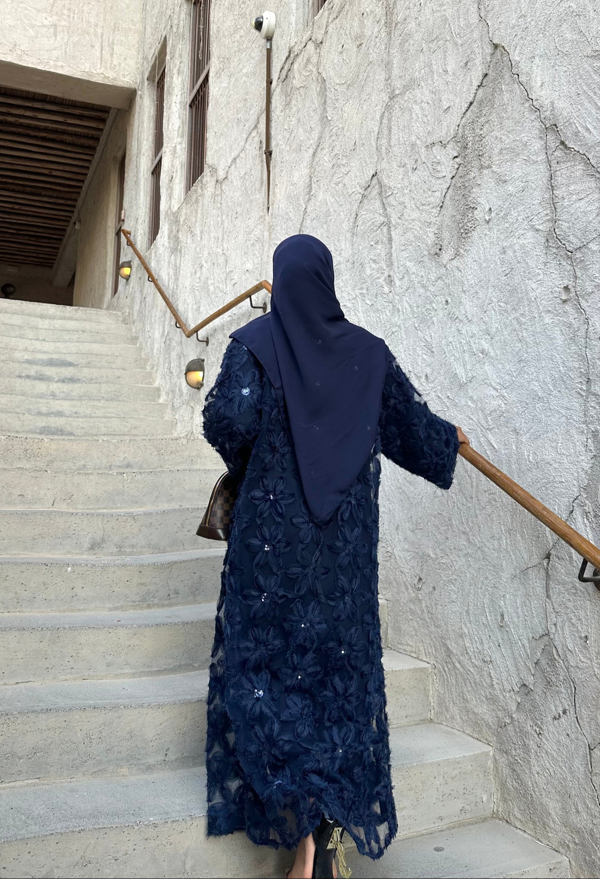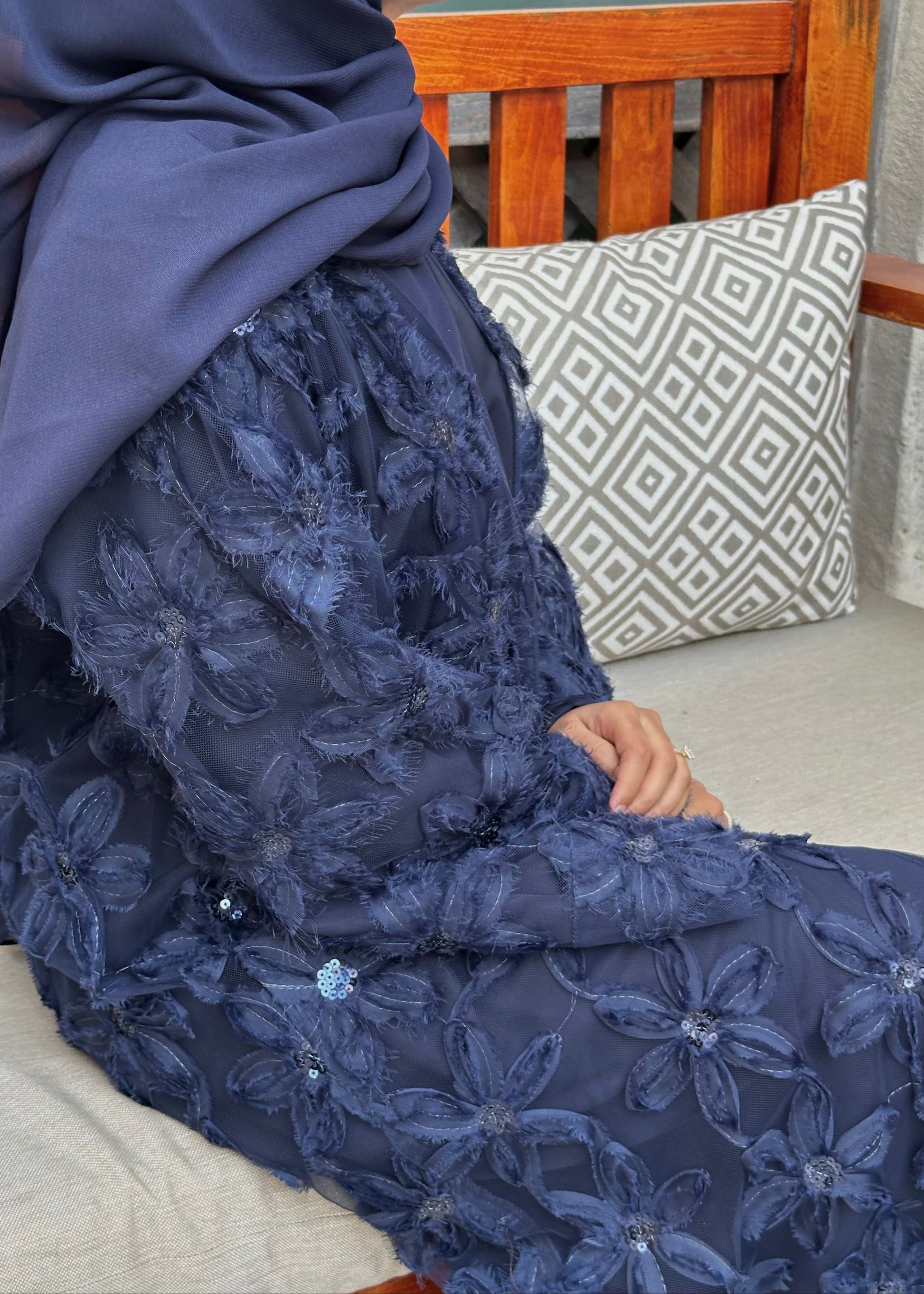 Bold, enchanting, and utterly feminine, Zahré in deep navy is a celebration of blooms. The outer layer is adorned with an abundance of exquisite floral appliqués, creating a lush, three-dimensional garden effect, while the long-sleeve inner adds elegance and structure. Zahré captures the beauty of a night in full bloom - dramatic, luxurious, and unforgettable. Model is 5'0" and is wearing a Size 50.